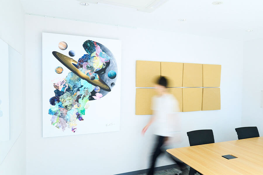 VCAでは、すでに作品価値の高いアーティストではなく世界に対して新しい創造を行おうとする若手アーティストからオフィスに飾る1mサイズ以上の作品を50万円で購入し、